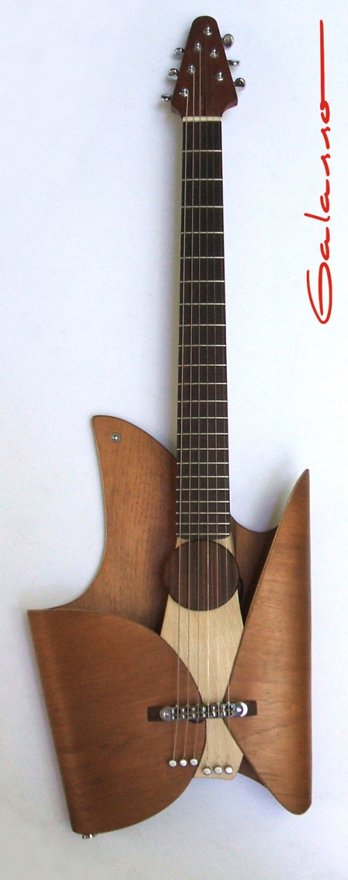 Наткнулся на очень интересную гитару от аргентинского мастера Ezequiel Galasso. Гитара называется «Leaf», сиречь «Лист». И действительно, очень похоже на лист. Находка с гнутым шпоном, как мне, довольно свежа. Все выглядит необычно и круто. В общем, смотрим фото.